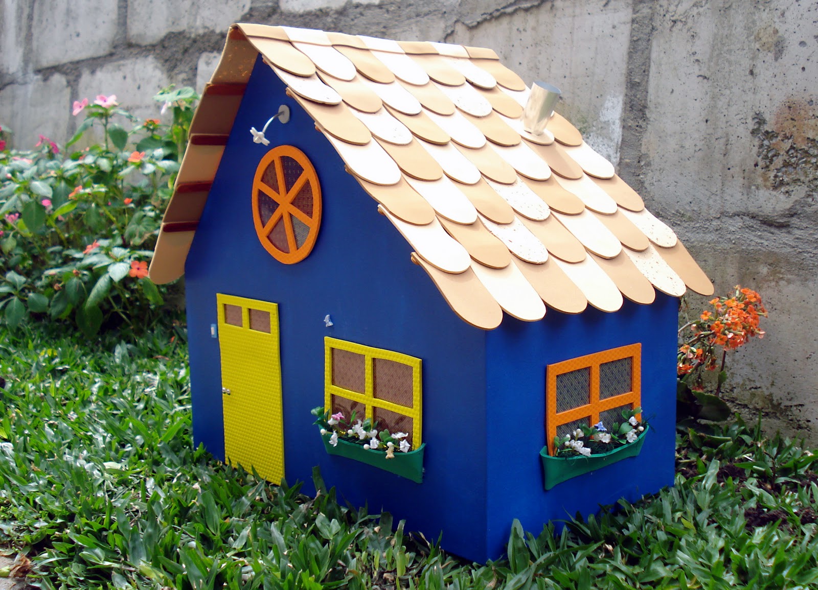 Em MDF, com portas, janelas e telhado de E.V.A. Dentro tapetes feitos de retalhos de forros de cadeiras. Tem até vidros nas janelas! Um amor né? Quer fazer uma tbém? Aceito encomendas!